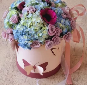 Большая шляпная коробка с белыми и розовыми кустовыми розами, альстромерией, герберой и зеленью